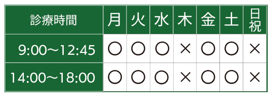 | 診療時間 | 月 | 火 | 水 | 木 | 金 | 土 | 日 |